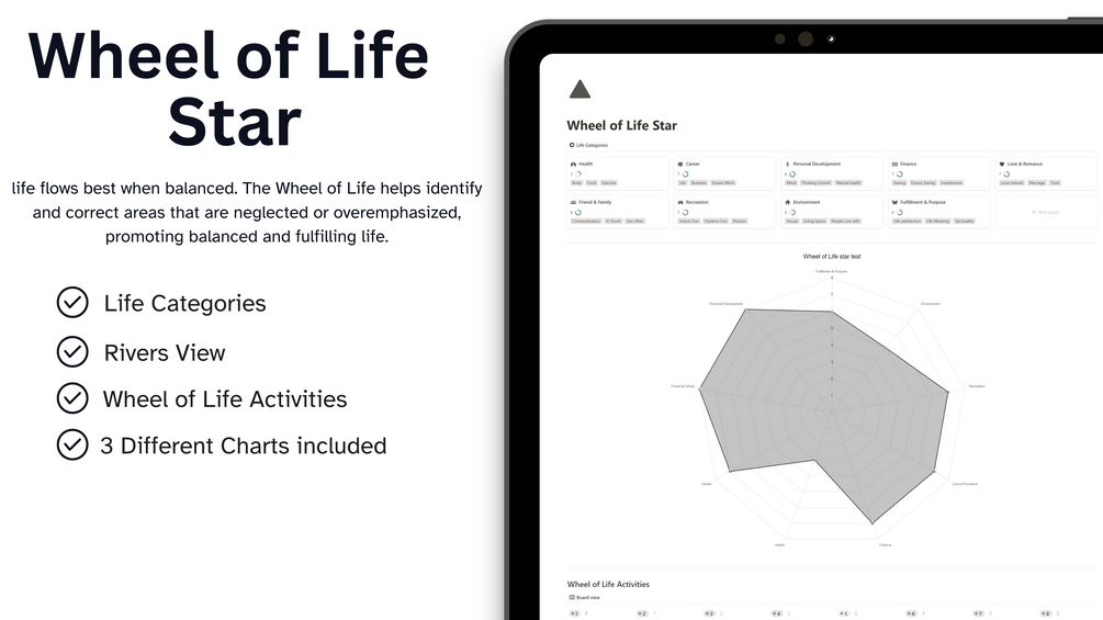 The Wheel of Life is like a river flowing through different aspects of your existence. Just as a river's flow can be disrupted by rocks and obstacles creating turbulent waters, our life can become unbalanced when certain areas are neglected or overemphasized. The goal is to achieve a smooth, steady flow—where each area of life moves in harmony with the others. This powerful self-assessment tool helps you identify where the current is too strong or too weak, allowing you to make adjustments for a more balanced journey.