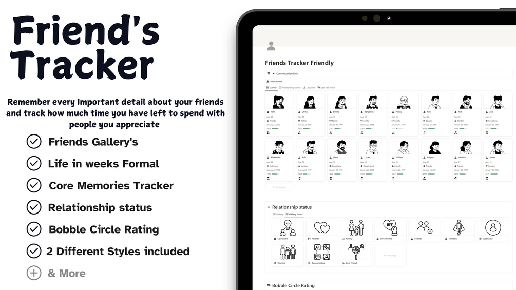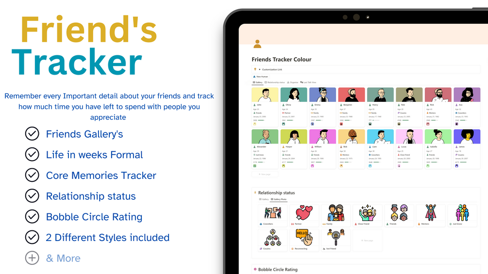 This comprehensive template is designed to help you maintain and enrich your personal relationships in the digital age. It's more than just a contact list - it's your personal relationship management system that helps you stay connected with the people who matter most. Whether you're keeping track of birthdays, remembering shared experiences, or making sure you're investing time in the right relationships, this template has everything you need to nurture meaningful connections.